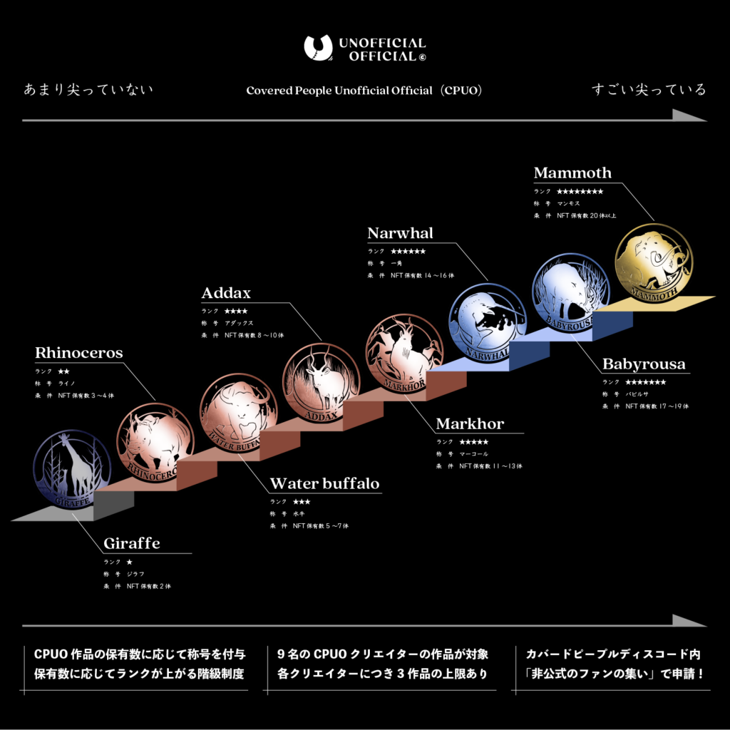 CPUO 尖っている制度 カバードピープル非公式オフィシャル(CPUO)クリエイターの対象NFT を集めることで、その保有数に応じた様々なユーティリティを受け取ることができるシステム